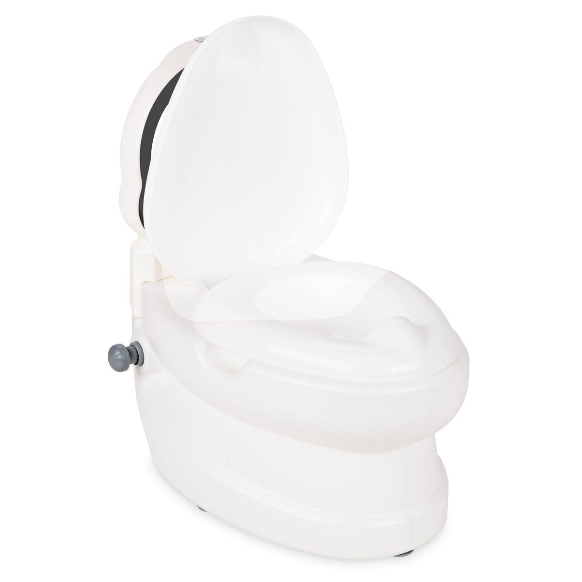 My Little Toilet de JAMARA offre un confort absolu sur le pot pour l'enfant. Il convient parfaitement comme « entraîneur de toilettes » (convient aux filles et aux garçons). Le pot avec différents motifs sur le dossier est antidérapant grâce aux ventouses spéciales sur le dessous et le récipient peut être retiré séparément pour le nettoyage. Un porte-rouleau de papier toilette pratique sur le côté et un module sonore avec chasse d'eau sonore et lumière LED complètent l'équipement pour les plus petits découvreurs.