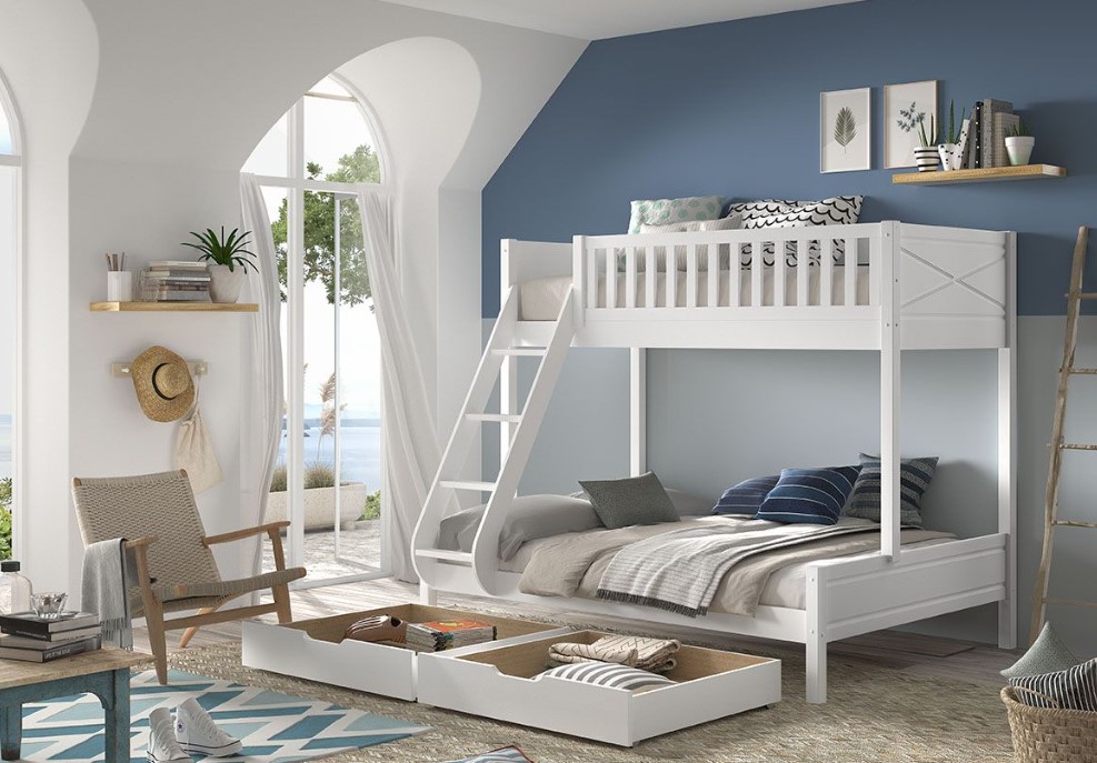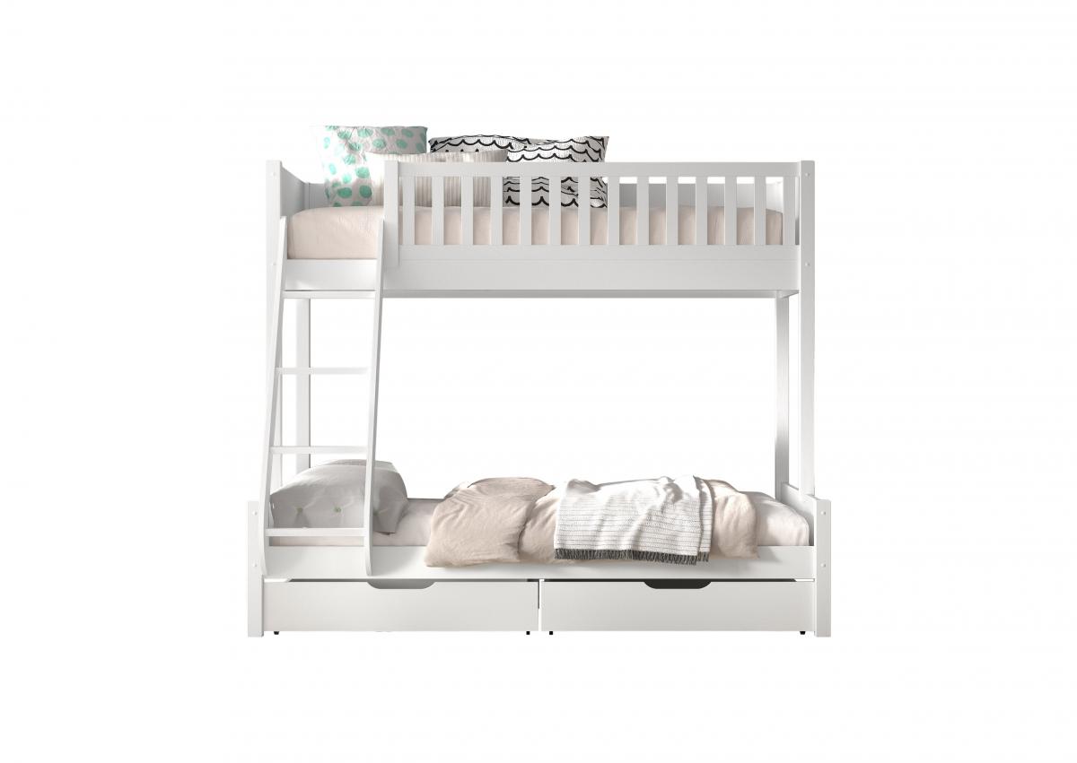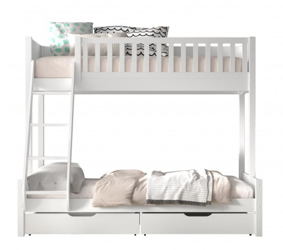Le lit familial SCOTT est laqué blanc et fabriqué en bois de pin scandinave massif. Les sommiers à lattes sont inclus. Ce lit garantit une capacité de couchage maximale dans un espace minimal. Le lit familial contient 3 places de couchage. En haut, il y a de la place pour 1 personne (90x200cm) et en bas, 2 personnes (140x200cm) peuvent dormir. Un tiroir peut être ajouté en option. Les 2 petits tiroirs sont parfaits pour ranger les jouets, les livres, la literie