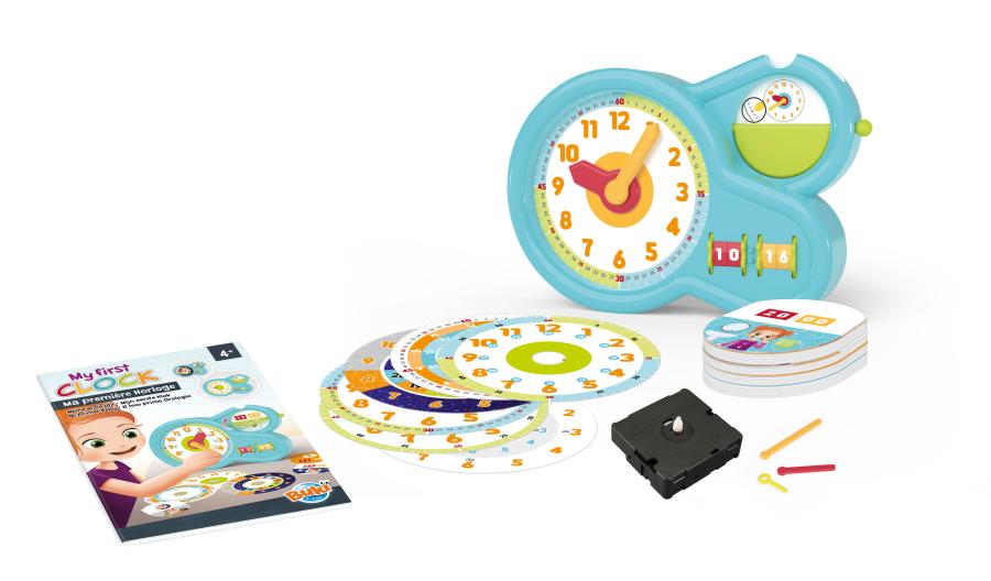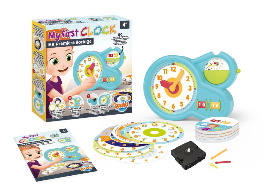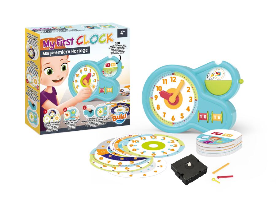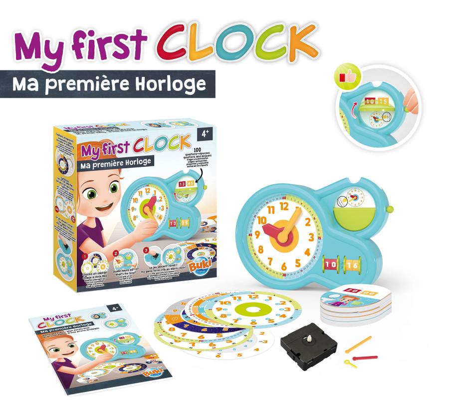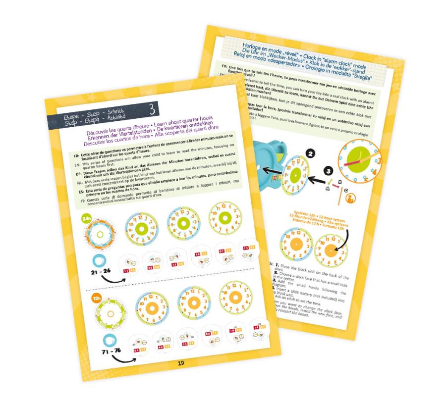 - L'enfant choisit le cadran pour apprendre à lire l'heure de manière progressive. Les premiers cadrans présentent les moments de la journée tandis que le dernier reprend le cadran d'une horloge.