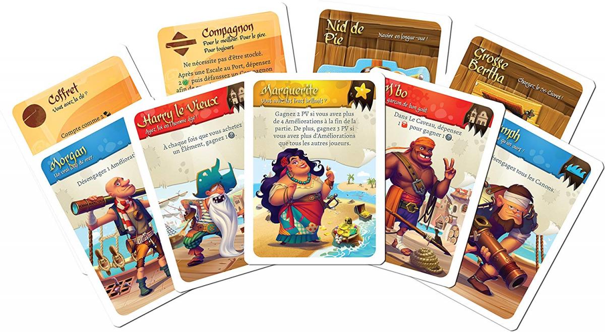 110 cartes (63x88mm, incluant les cartes Capitaine, cartes Matelot, cartes Amélioration, cartes Point de Victoire, cartes Aventure et cartes des mini extensions)