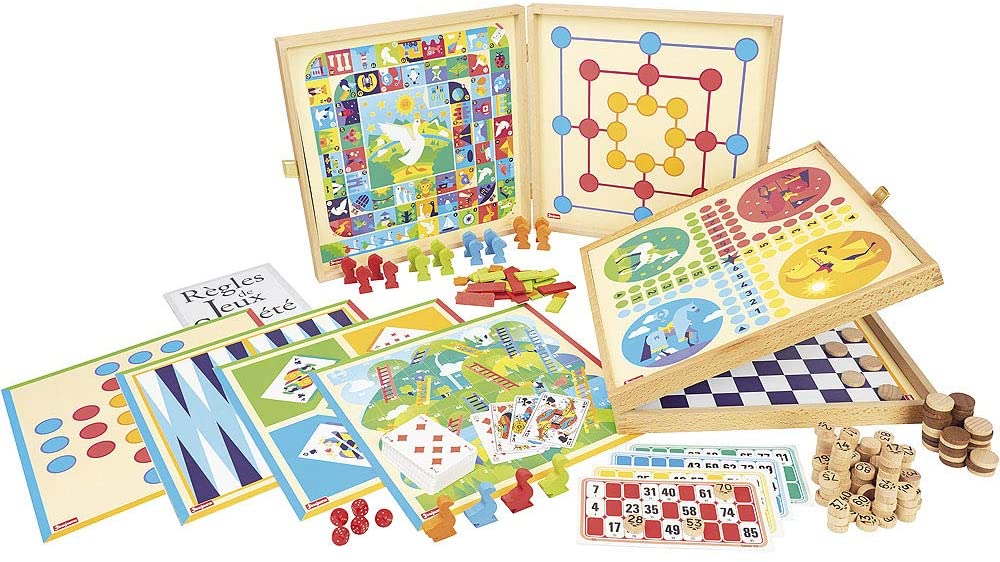 Coffret de Jeux Classiques – 150 règles – coffret en bois : Jeux des petits chevaux, jeu de l'oie, dames, marelle, solitaire, échelles, nain jaune, jacquet, loto, yams, 421, jeu de 54 cartes. Pions en bois : 40 dames, 4 oies, 16 chevaux, 5 dés, pions de loto et jetons. Livret de règles des jeux.