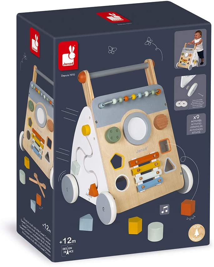 Contient 1 chariot multi-activités (9 activités : boulier, boite à formes, tambour, xylophone métal, bouton rotatif sonore, gratte-gratte,miroir rotatif grossissant, labyrinthe, engrenages). Dimensions du jouet : Longueur 34,5 cm x Largeur 37 cm x Hauteur 47,5 cm. Matériau(x) utilisé(s) : Bois (contreplaqué, bois massif, MDF), Feutrine, Métal.
