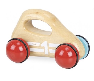 Voiture 1er âge en bois naturel vernis. Roues bicolores rouge et bleues. A partir de 1 an.