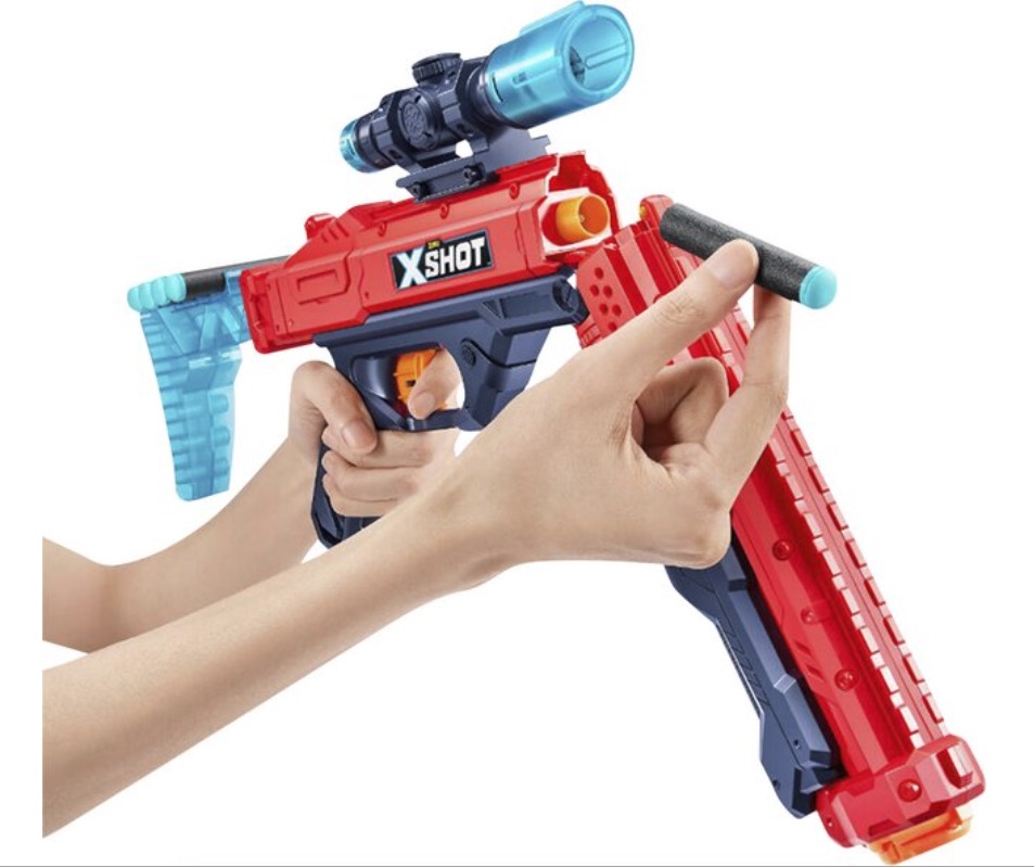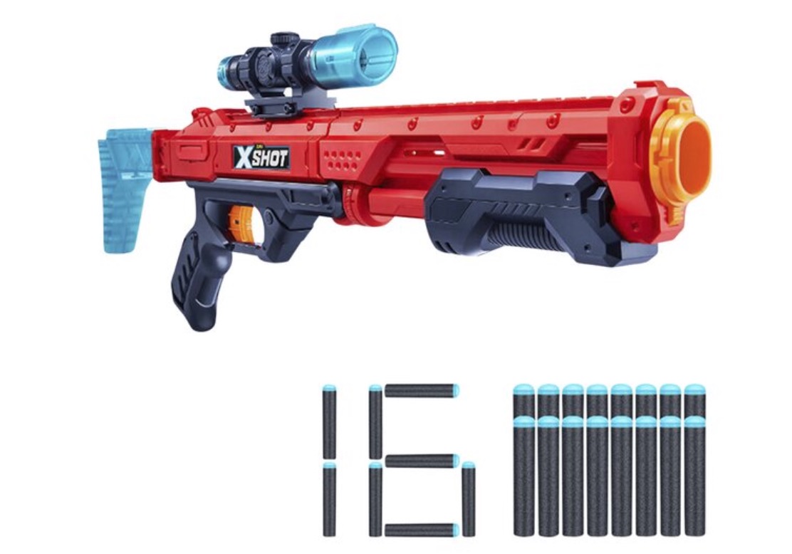 Ce fusil Zuru X-Shot Excel Hawk Eye possède une portée de tir de 27 mètres.