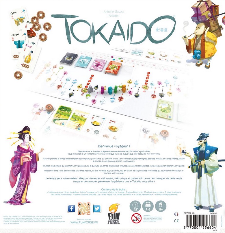 Dans ce jeu créé par Antoine Bauza et illustré par Naïade, parcourez la célèbre route du Tokaido en tentant de faire le plus beau et le plus accompli des voyages. Tokaido est un jeu de plateau de parcours et de collection pour 2 à 5 joueurs.