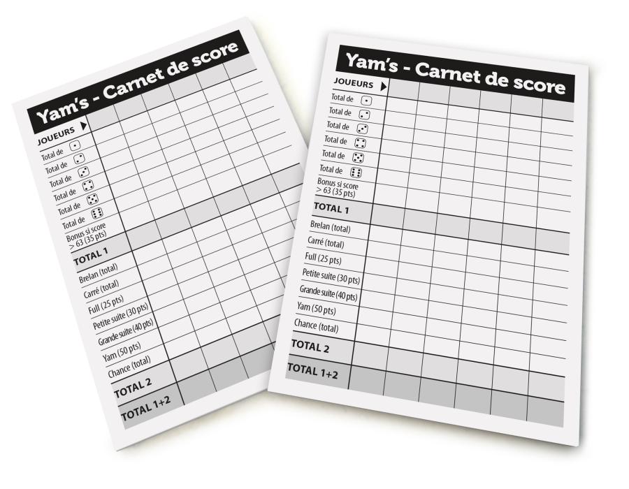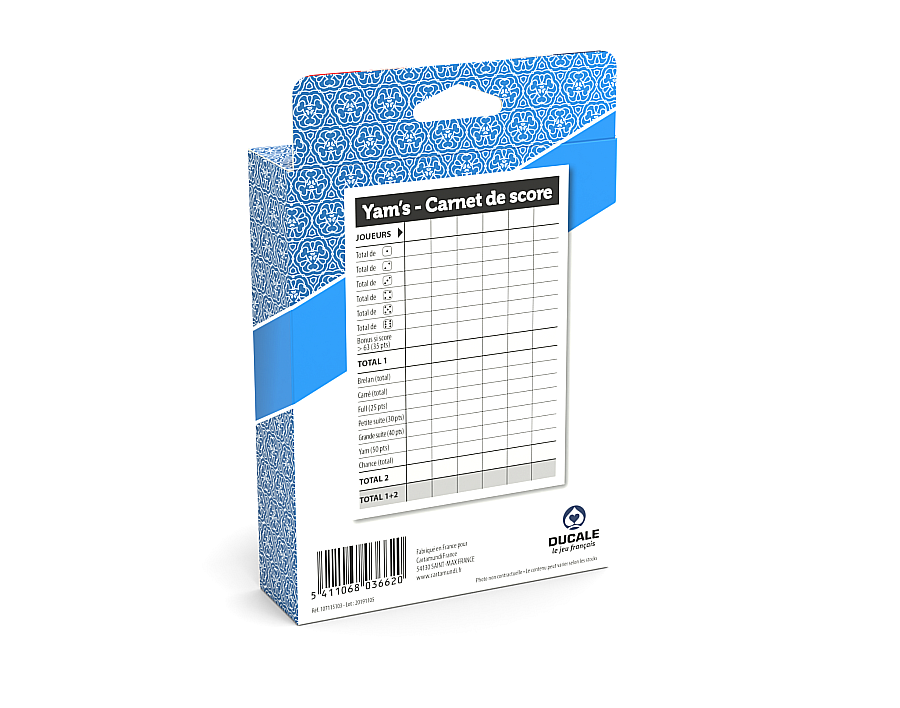 Partager votre plaisir de jouer avec le jeu de Yam's ! Aurez-vous les yeux plus gros que le ventre ? Prenez tous les dés en main avec assurance, secouez fort vos poignets (il paraît que plus les dés sont bien mélangés, plus les enzymes de chance s'activent), embrassez vos mains... et lancez tous les dés ! Alors, on garde les 2 dés de 5 et on relance. Bon finalement, on garde les 3 dés de 6 ou on tente le Yams ? Ah dommage. Chaque joueur bénéficie de 3 lancers de dé(s) pour marquer le plus de points possibles selon les 13 combinaisons proposées dans le bloc de score : Carré, Full, petite et grande Suite... Un jeu de hasard simple et familial, qui facilite également l'apprentissage des calculs. Son format voyage est idéal pour emmener votre jeu partout, en toutes occasions. Dès 6 ans, 1 à 6 joueurs Contient 2 blocs de score Yams de 40 pages chacun (sans dés).