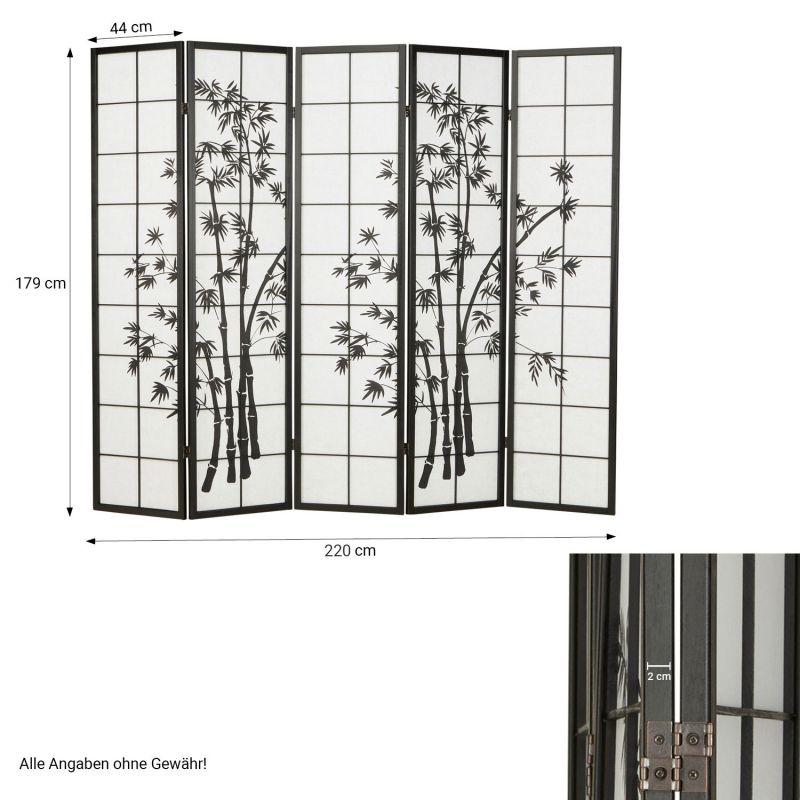 paravent stable en bois noir en 5 partiesMotif bambou en aquarelle sur le devant