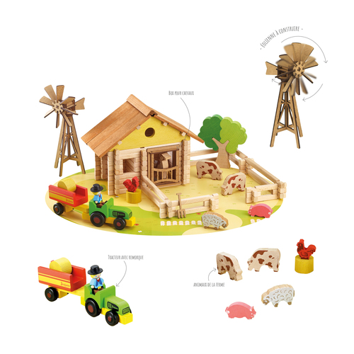 Ma Ferme en Bois - 145 pièces : jeu de construction en bois naturel et teinté avec une notice de montage, un tapis de jeu et de nombreux accessoires et animaux. Valisette carton : 39 x 32 x 11 cm - A partir de 5 ans.